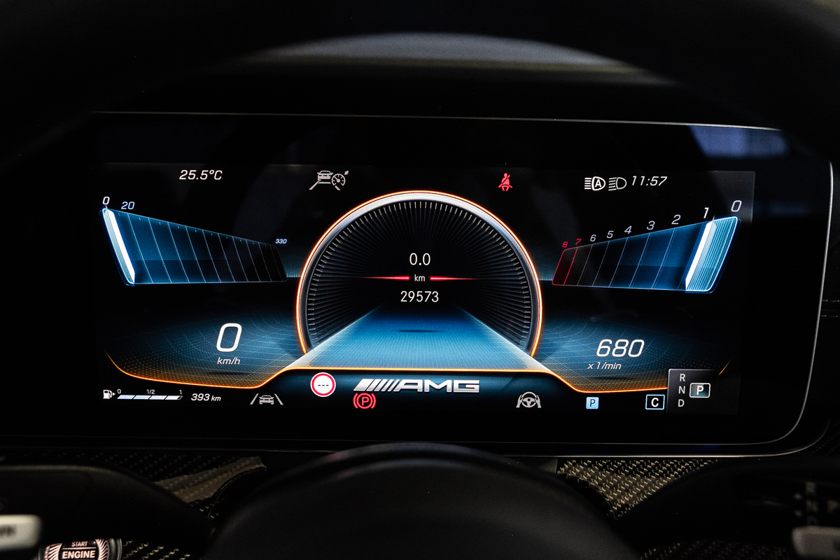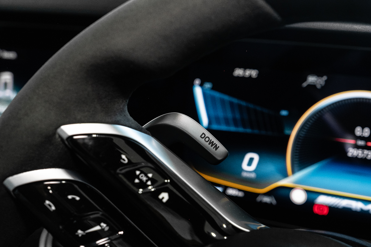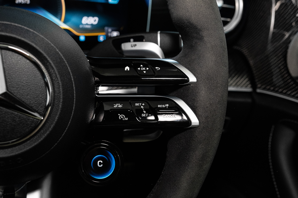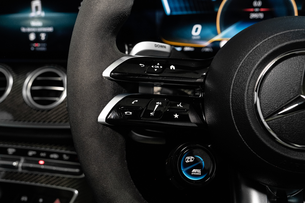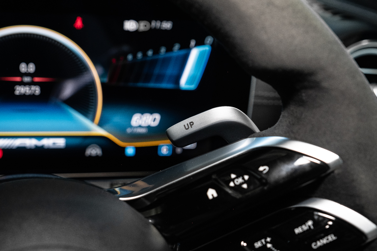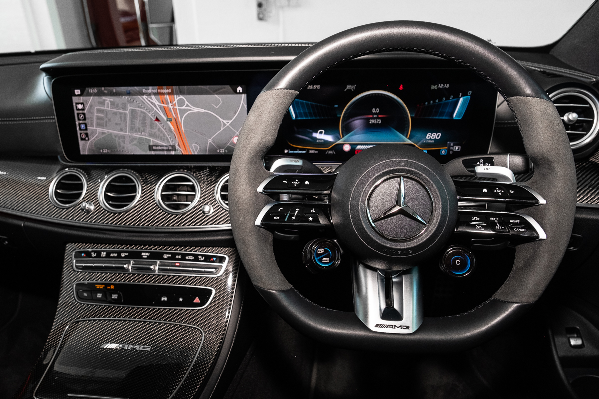 Inside, the theme continues. Black Nappa leather, carbon-fibre trim, and AMG Performance seats make the cabin feel purposeful but never brash. Everything you touch has weight and substance - the steering wheel rim, the paddle shifters, even the click of the drive-mode selector. It’s a rare thing now: a genuinely physical driving experience in a world increasingly made of screens.